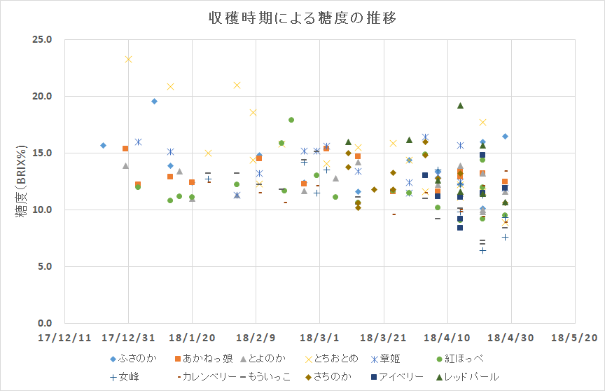 収穫時期による糖度の推移を、散布図に