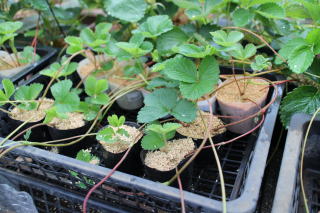 いちごのランナーを整理し、子株をポリポット