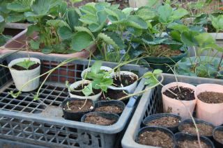 いちごのランナーを整理し、子株をポリポット